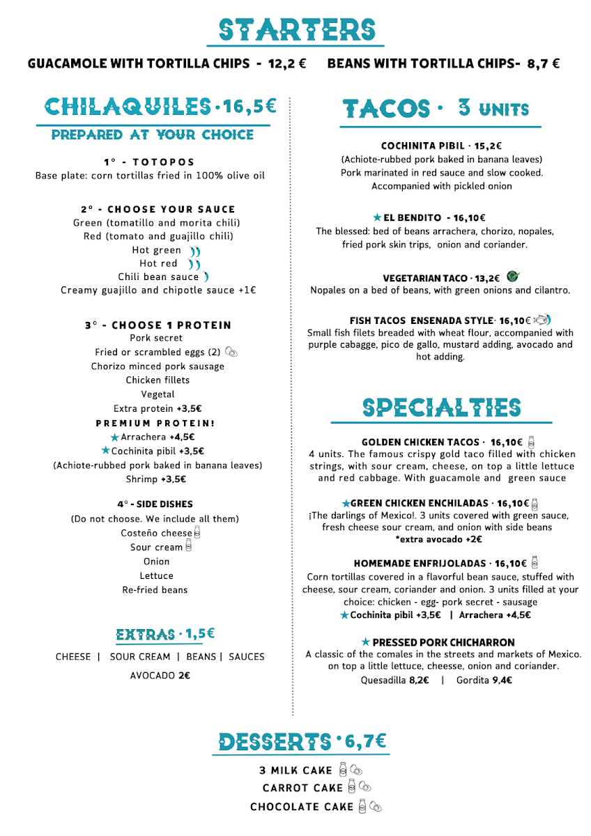 One of the standout offerings is the Chilaquiles a Tu Gusto, presenting crispy tortilla triangles generously drizzled in your choice of mild red or green salsa, topped with eggs and served alongside fresh lettuce, cream, and cheese—an explosion of flavor at just €16.50. For a true taste of Mexico, indulge in the Enchiladas Verdes de Pollo, three vibrant enchiladas bathed in green salsa, perfect for only €16.10.